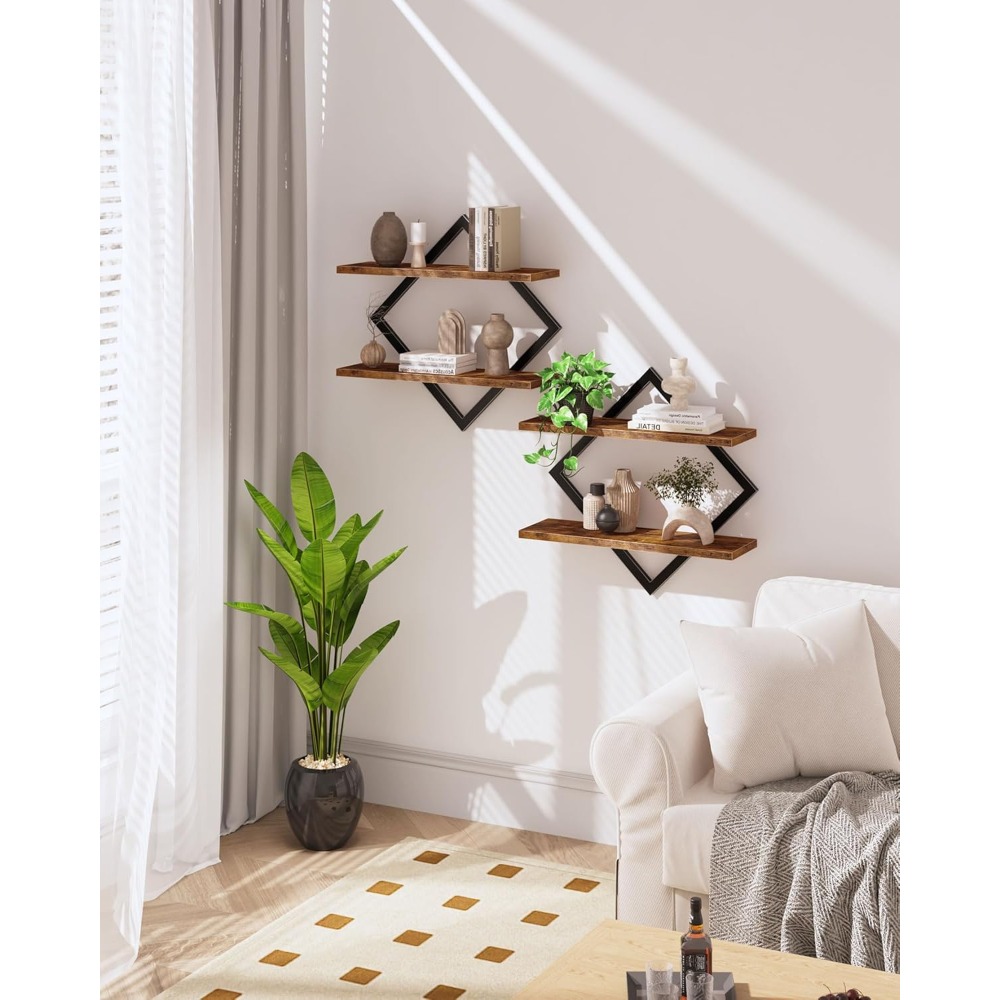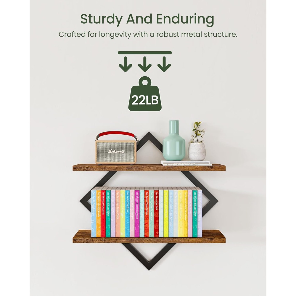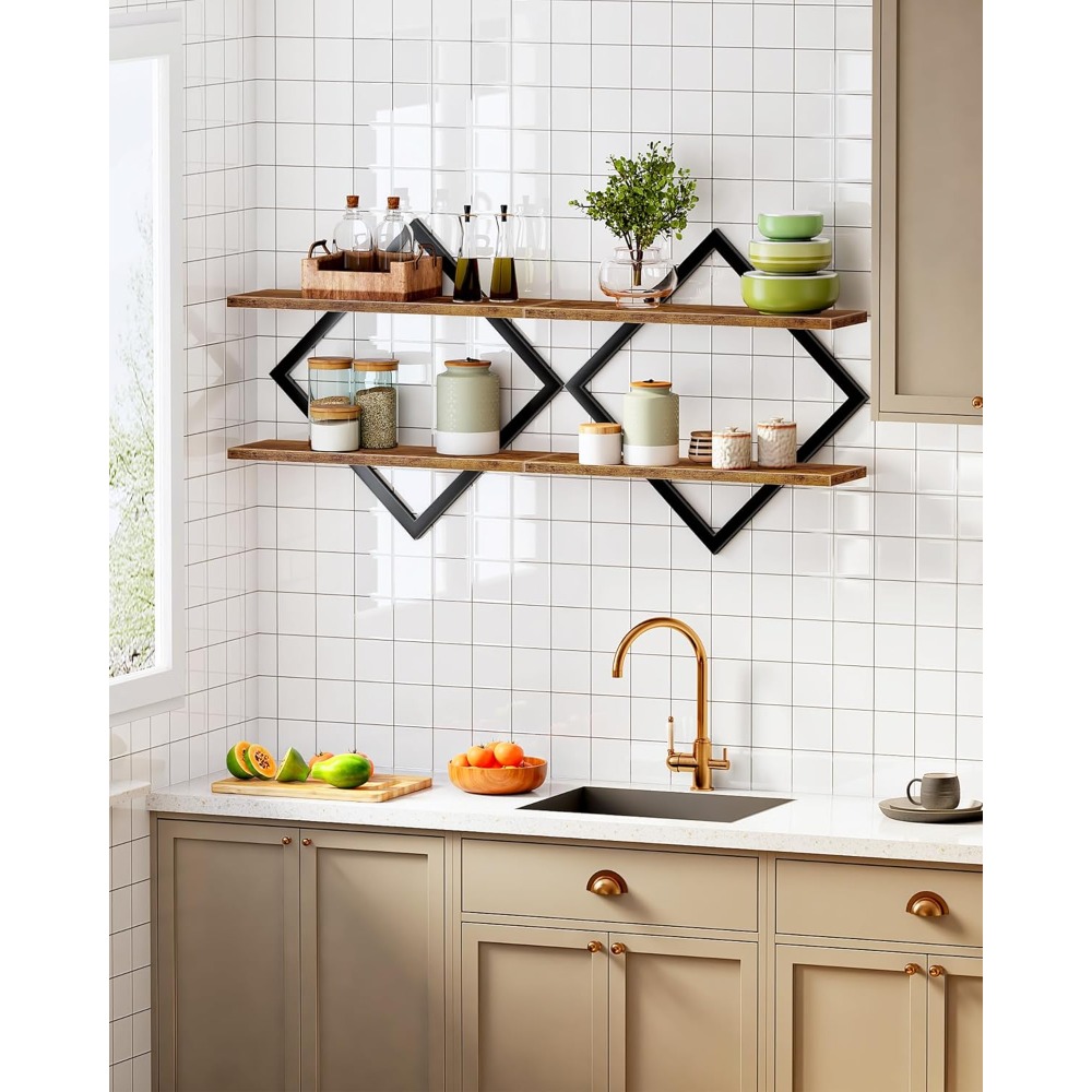 Set of 2 Wood Floating Shelves - Heavy-Duty Rustic Brown Wood Grain Wall-Mounted 2-Tier Hanging Shelves with Black Brackets, Easy Install for Living Room, Bedroom, Kitchen, Office - Sturdy Storage & Display (No Visible Bracke